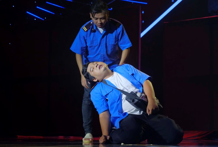 Đầu tiên, chiếc gương kỳ lạ và hình ảnh chú hề vui vẻ trong gương được nam thí sinh khai thác một cách thông minh, mang lại nhiều tiếng cười.
