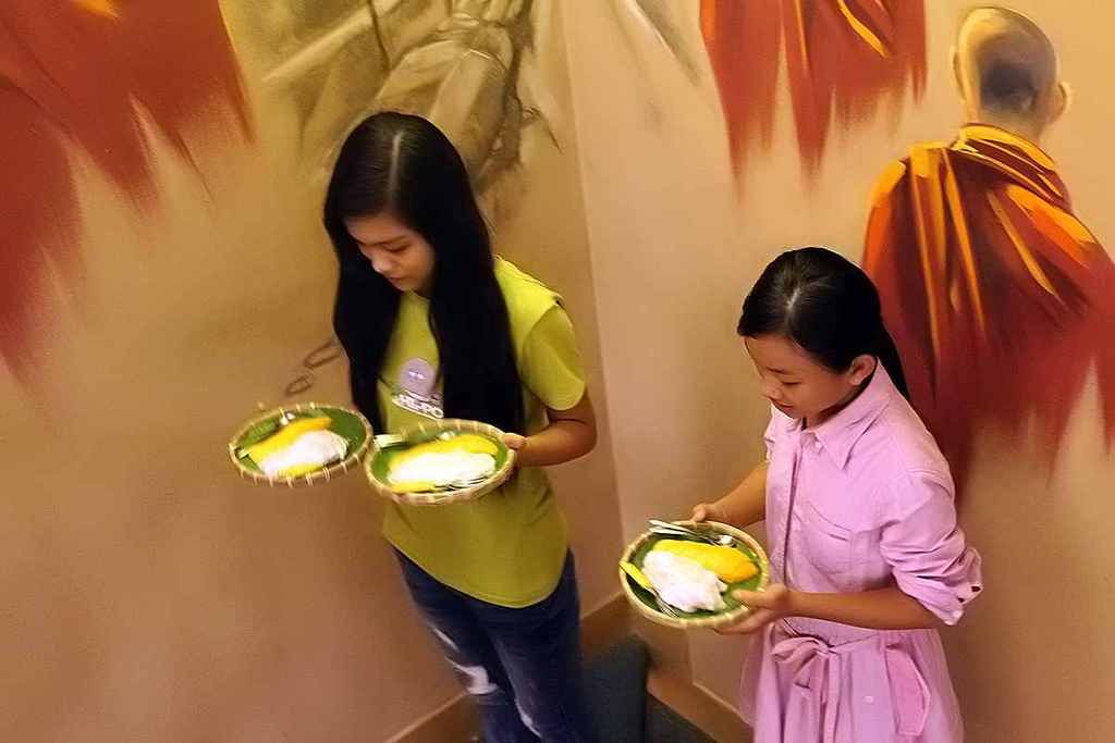 Thiêng Ngân (áo hồng) và Thu Hiền phụ mẹ chuẩn bị đồ ăn cho các em